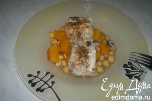 1 Цуккини режем кубиком и кладем в кастрюлю с 1 столовой ложкой оливкового масла, добавляем специи ,чеснок и лимонную цедру, обжариваем 4 минуты, добавляем воды и кладем сверху рыбу, рыбу немного подсаливаем и накрываем крышкой на 20 минут. Рыба будет готовиться практически на пару пропитываясь ароматом специй. |