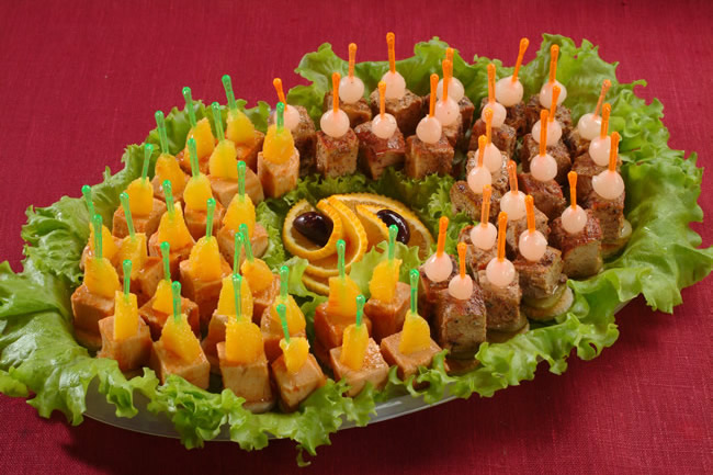 же нарезать. Манго и утку нанизать на 10-12 шампуров